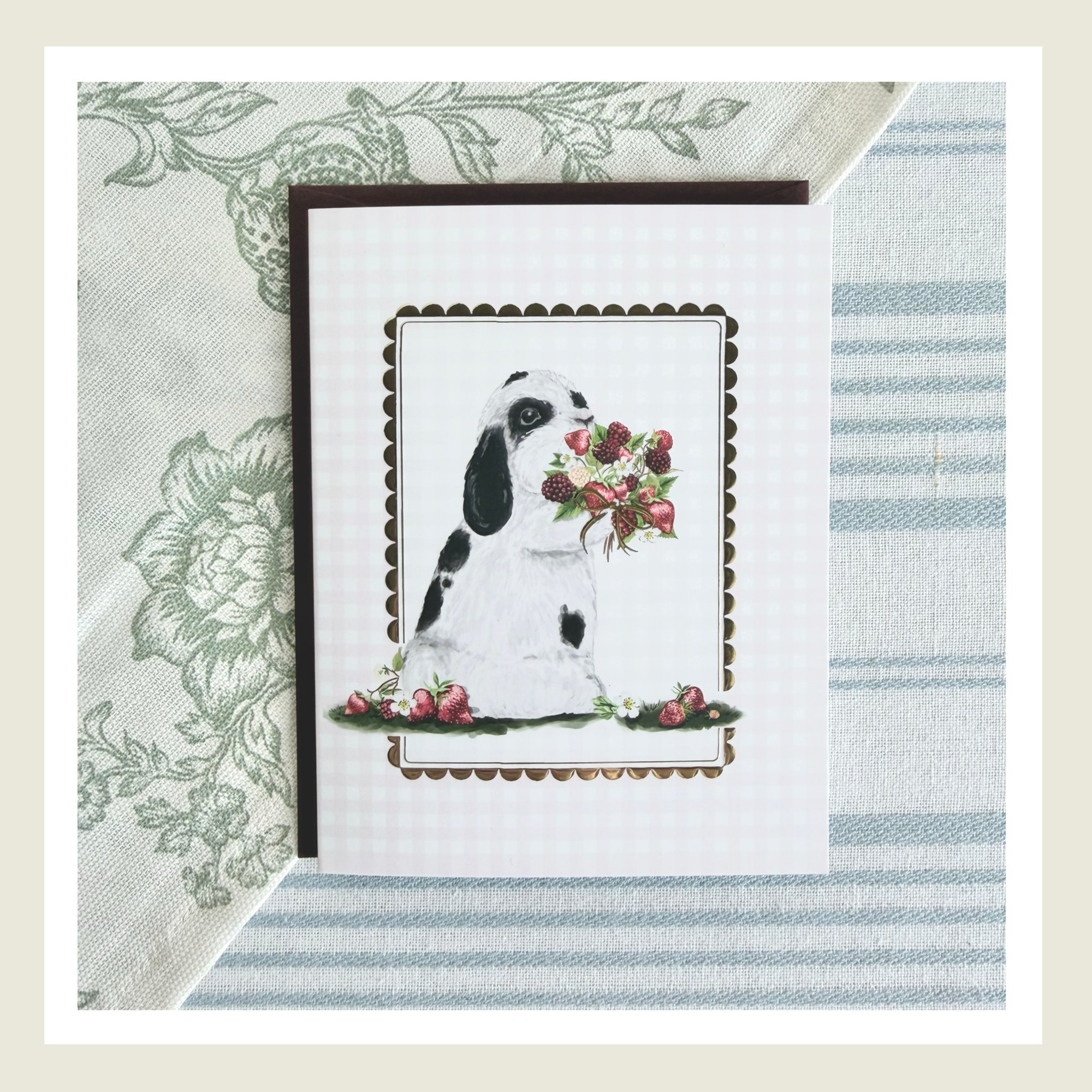 From a real life bunny named Peanut Butter, this whimsical illustration is printed on a heavy coated card with soft finish & gold embossed details to elevate your greeting to the next level.